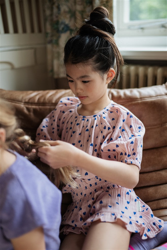 Lichtroze zomerse top met pofmouwtjes en blauwe hartjes. Het lint op de rug maakt deze top extra feestelijk.