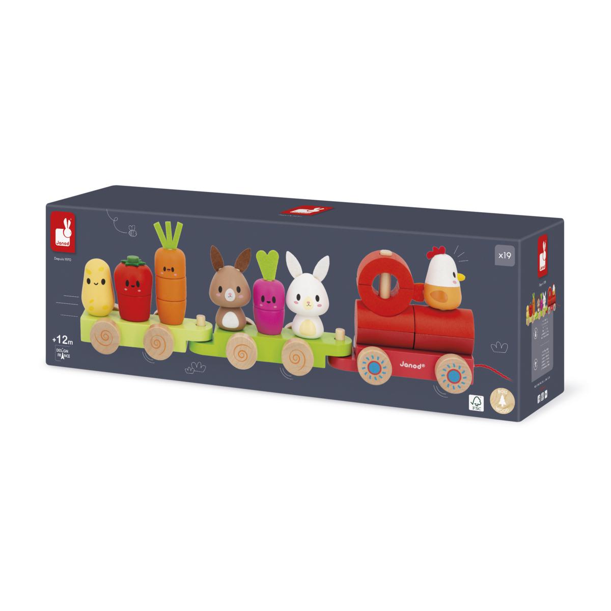 Tjoek! Tjoek! Laat de kleine boerderijtrein passeren met zijn groenten en kleine dieren! Mooie houten trein uit 3 wagons meet 19 stukken om in elkaar te zetten voor het maken van groenten en boederijdieren.