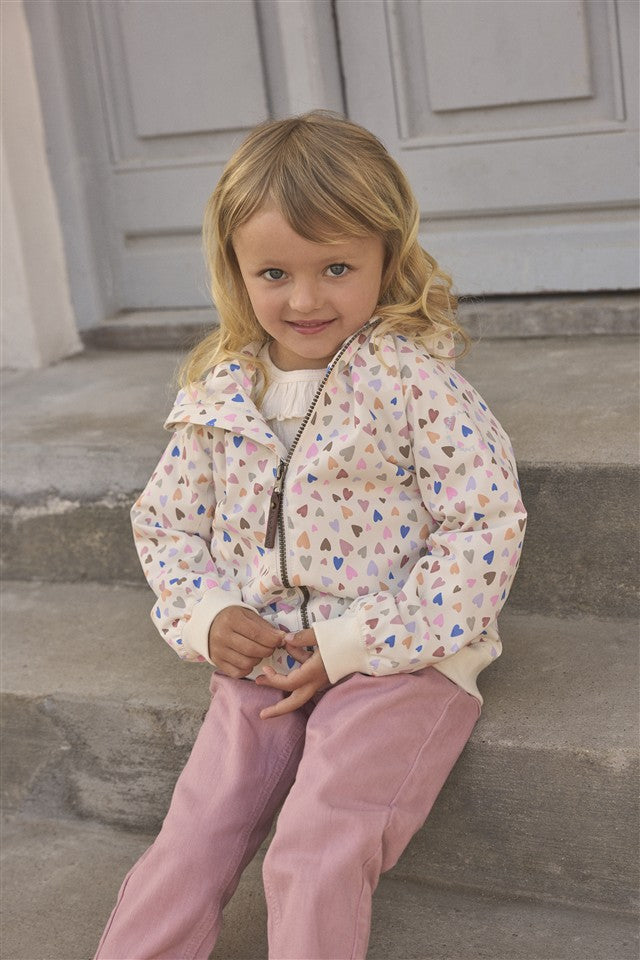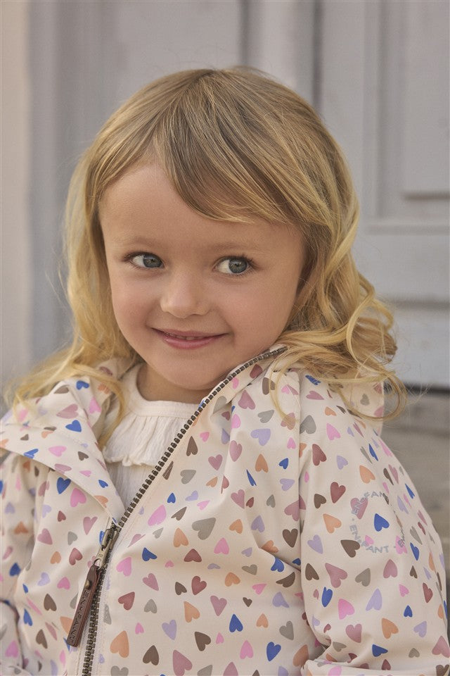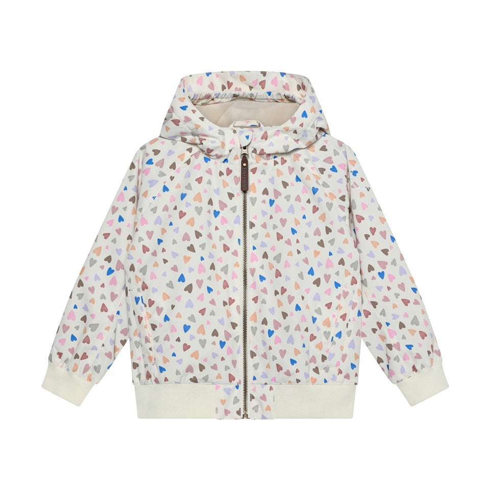 Technische zomerjas in wit met all-over gekleurde hartjes. Met kap en zakken.