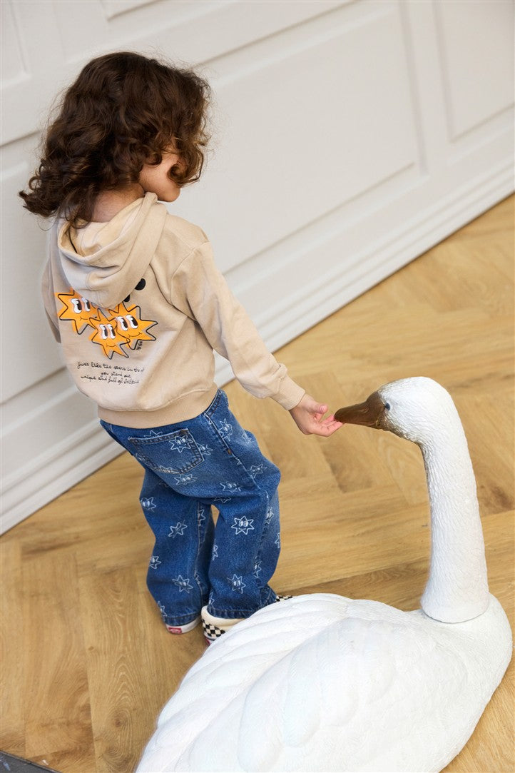 Stoere donkerblauwe jeansbroek met wijde pijpen en all-over print met sterren.