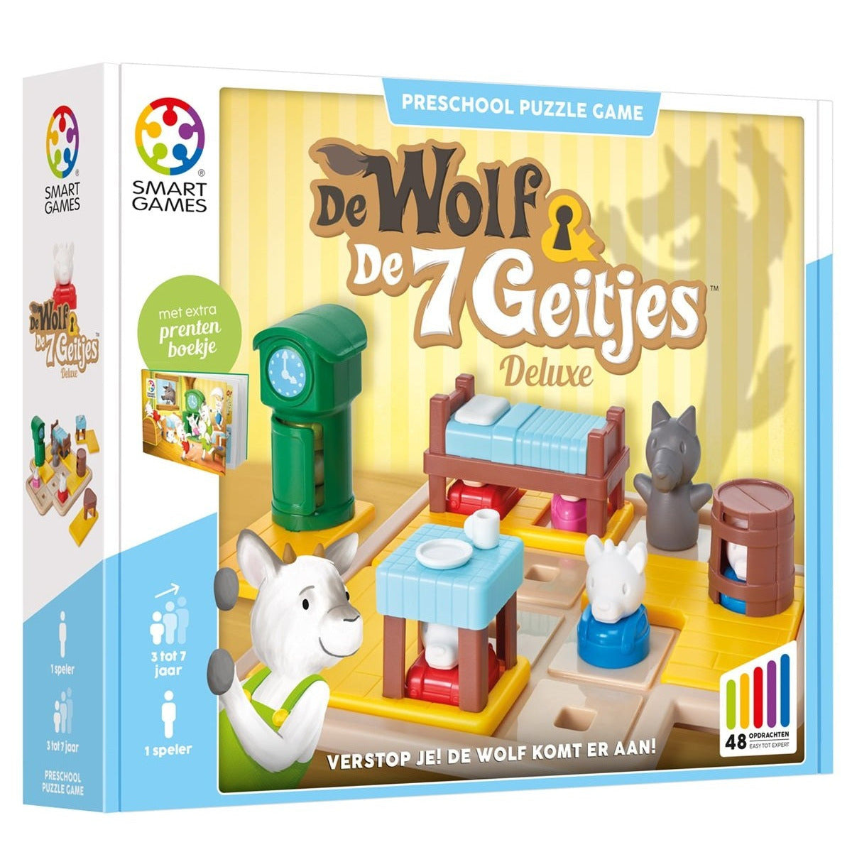 Dit sprookje helpt kleuters hun logica- en deductievaardigheden, vormherkenning en oriëntatie verder te ontwikkelen. Probeer één van de 48 opdrachten op te lossen die geschikt zijn voor de leeftijd van 3 tot 7 jaar en ontdek samen het sprookje van de geitjes en de wolf met het leuke verhalenboekje.