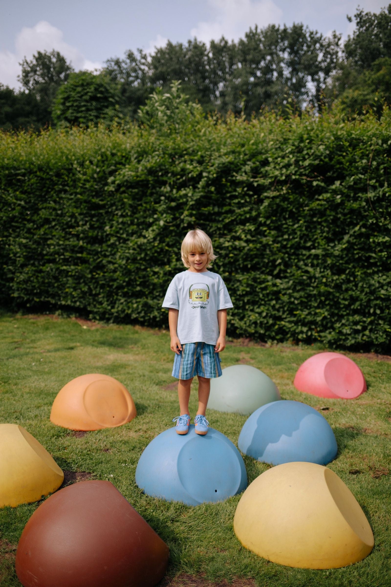 Lichtblauwe tshirt met prent van cassetterecorder met hoofdtelefoon.