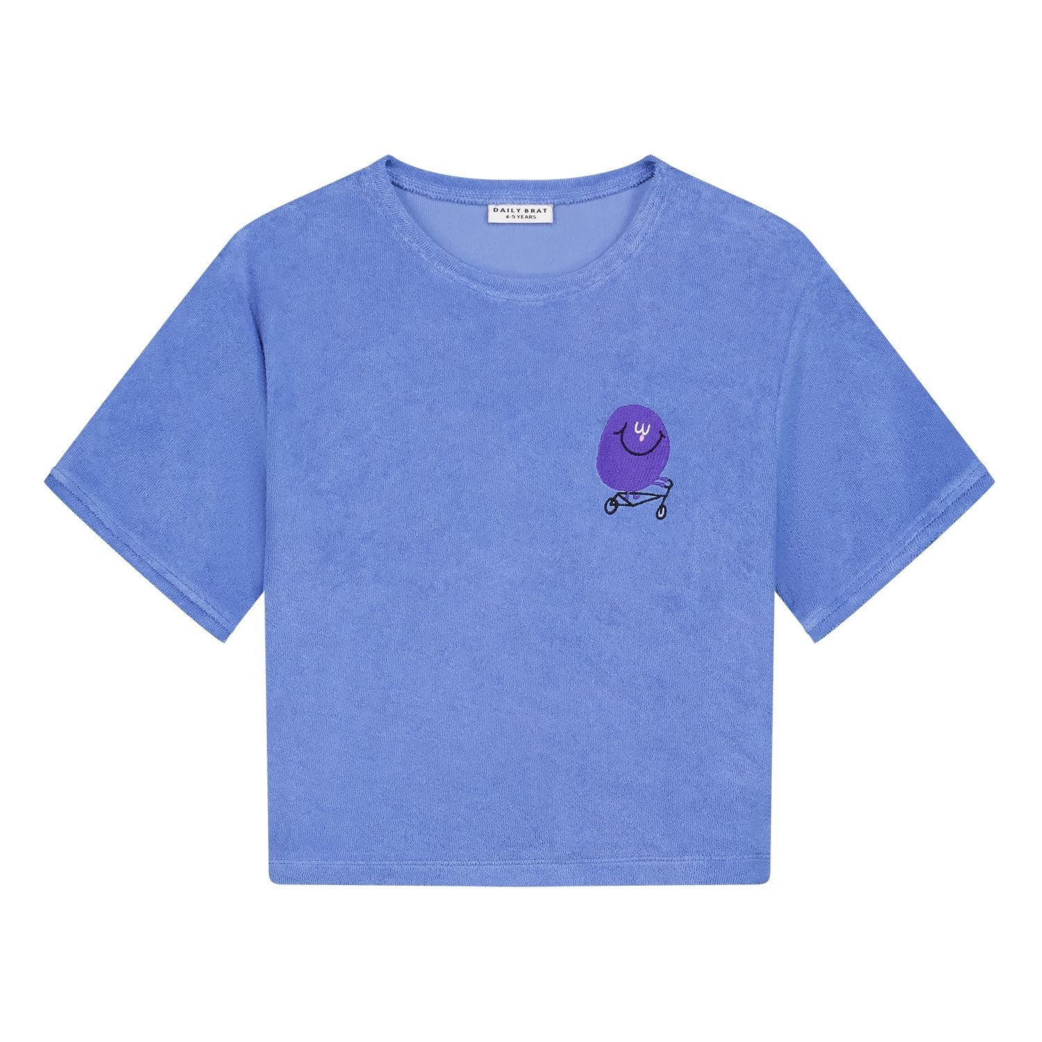 Blauwe tshirt in badstof met geborduurde figuur op de voorzijde.