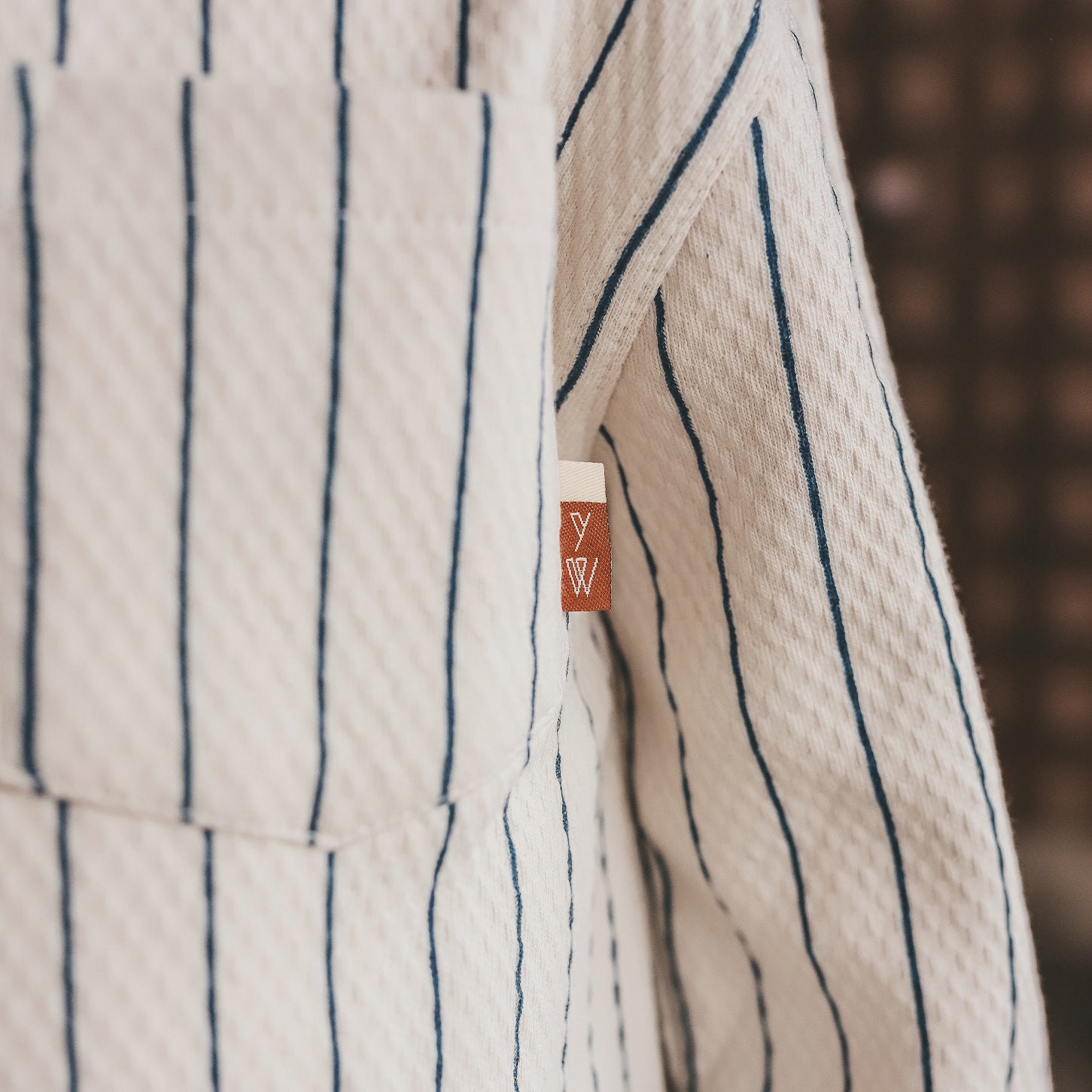 Hemdje in zachte katoen in gebroken wit met blauwe strepen.
