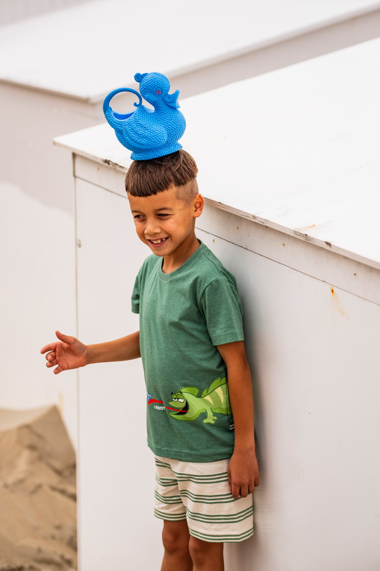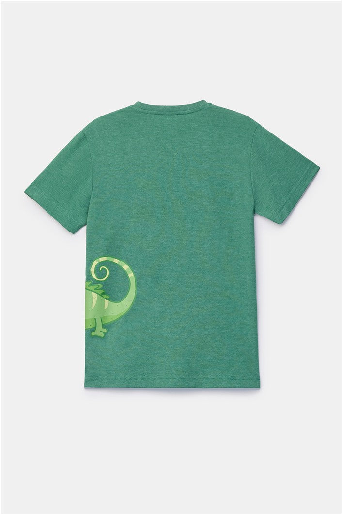 2-delige pyjama met korte mouwen en pijpen. Bovenstuk in effen groen met print van kameleon op de onderkant. Short effen ecru met groene strepen.