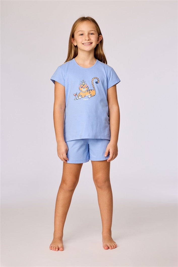 2-delige pyjama met korte mouwen en pijpen. Bovenstuk in effen blauw met print van tijger. Short in effen lichtblauw.