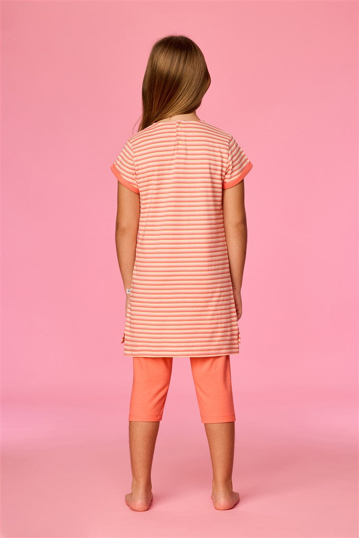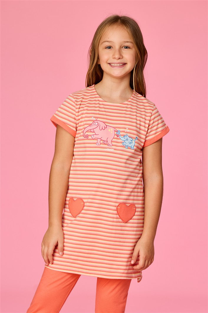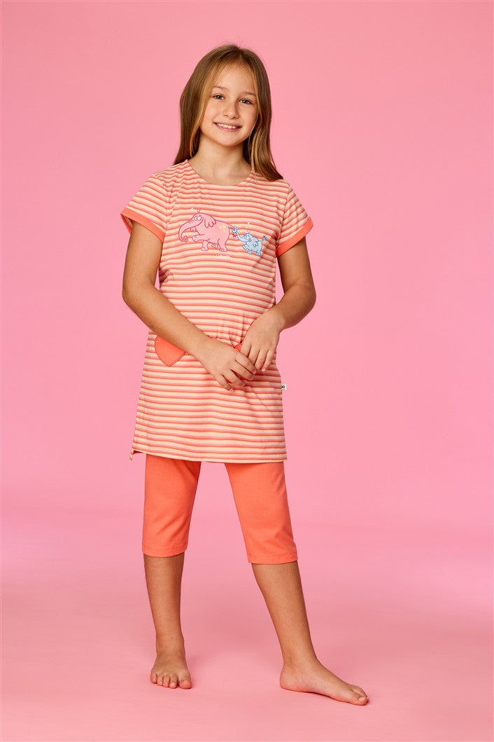 Perzikoranje gestreepte tuniek met olifantjes. Gestreept bovenstuk en effen roze 3/4 broek.