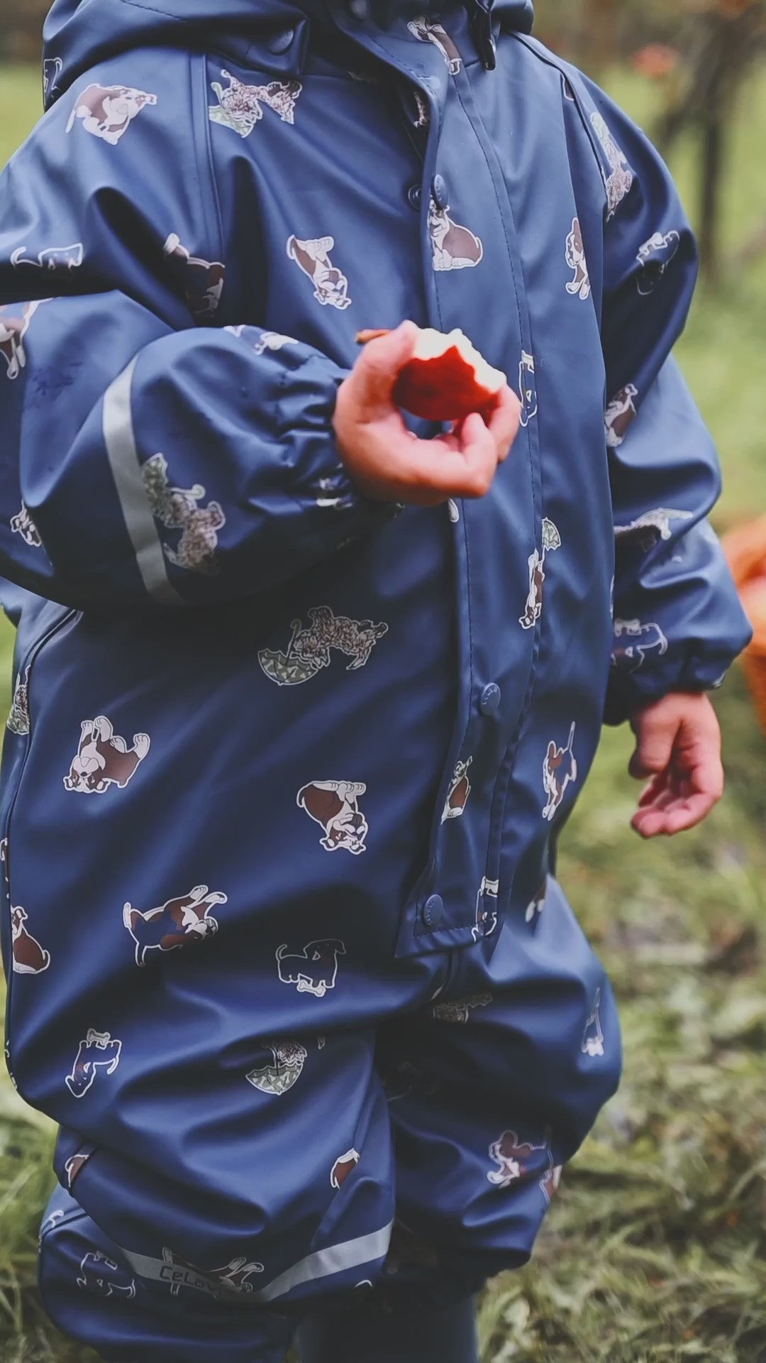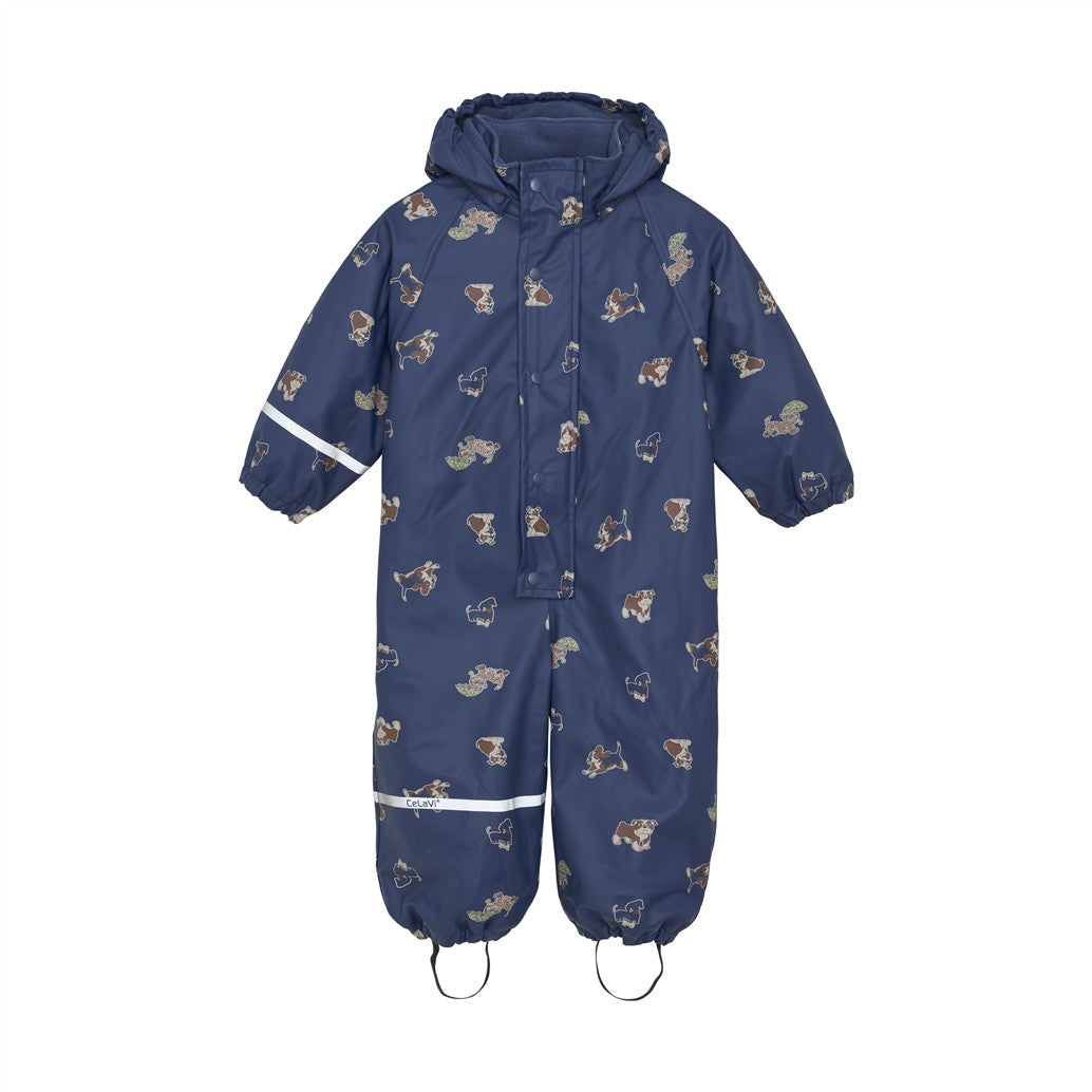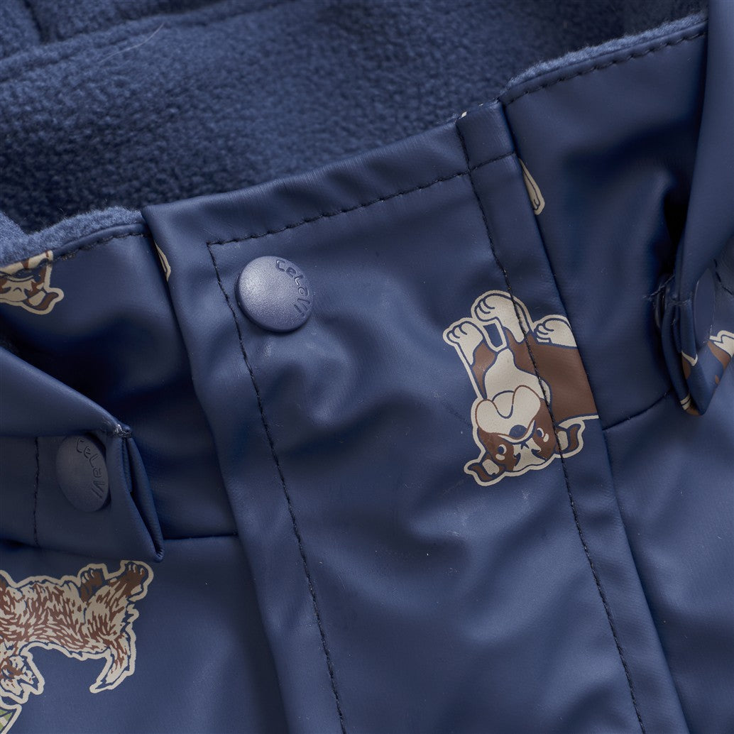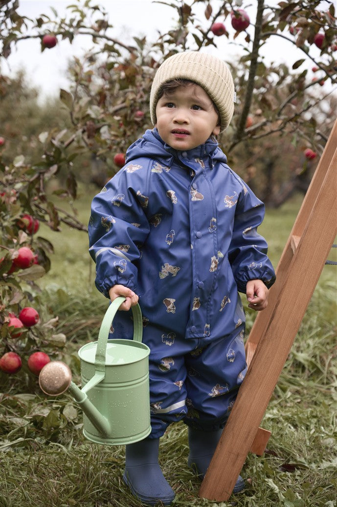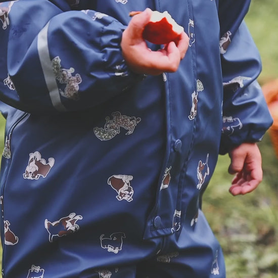 Het marineblauwe design is speels afgewerkt met een vrolijke hondenprint, waardoor het regenpak zowel praktisch als charmant is. Perfect voor buitenpret, wandelingen in het bos of modderige speelmomenten in de tuin.
