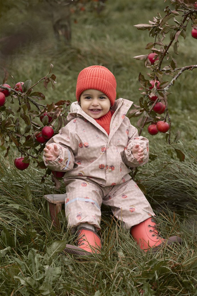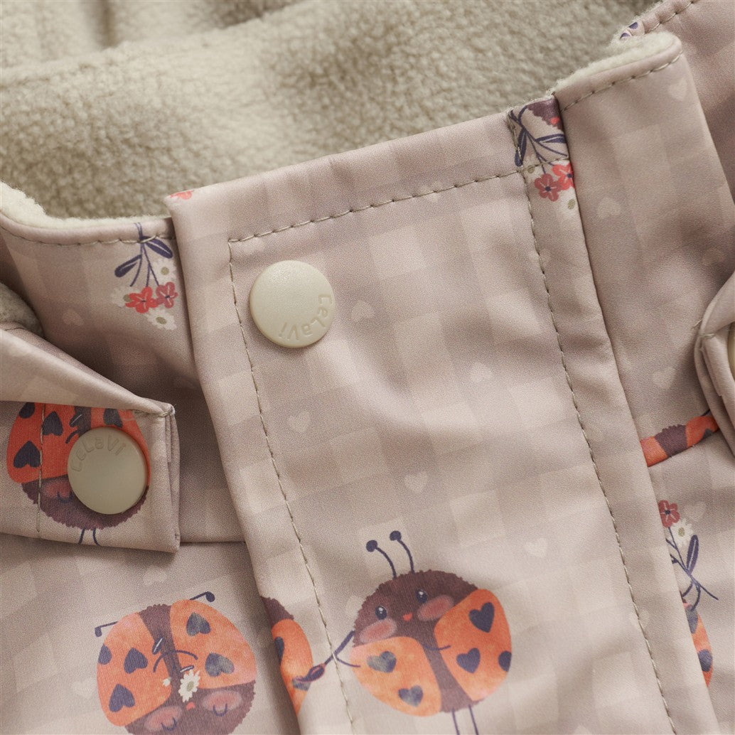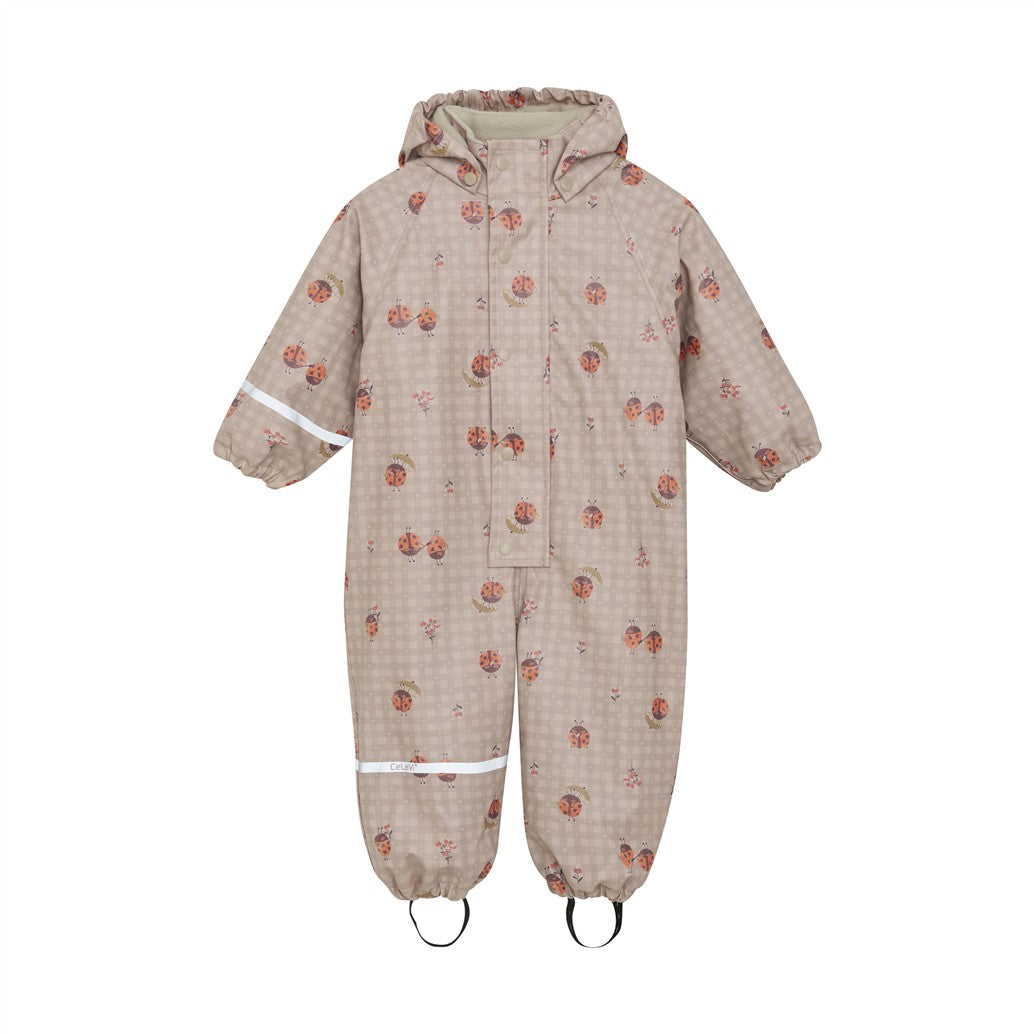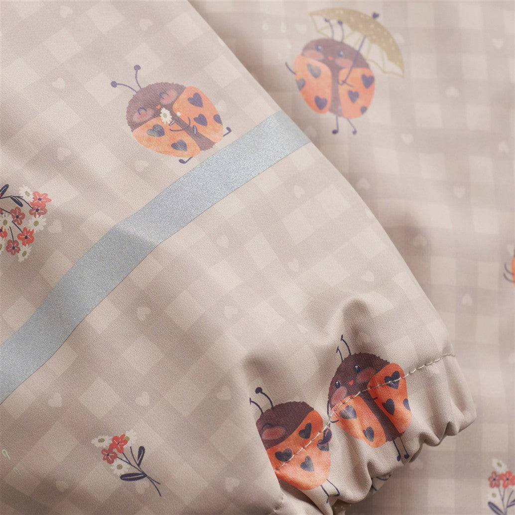 Het stijlvolle bruin/beige geruite design wordt speels afgemaakt met een vrolijke print van lieveheersbeestjes, waardoor het pak zowel praktisch als charmant is. Ideaal voor buitenpret, boswandelingen of modderige speeluren in de tuin.