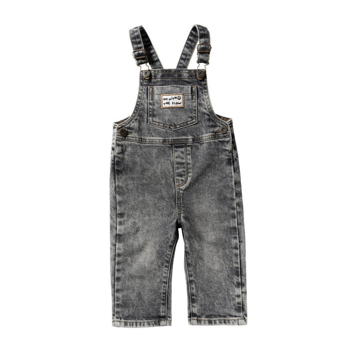 Stoere grijze tuinbroek in soepele denim. Op de voorzijde een patch met "Go with the flow".