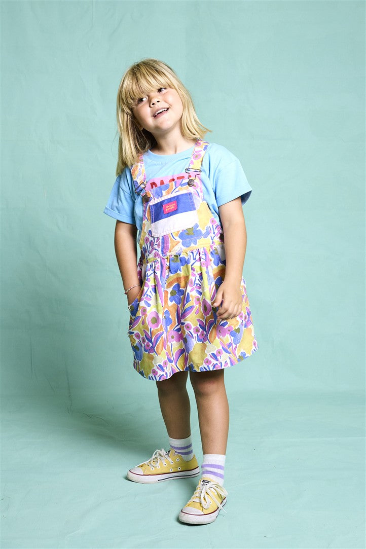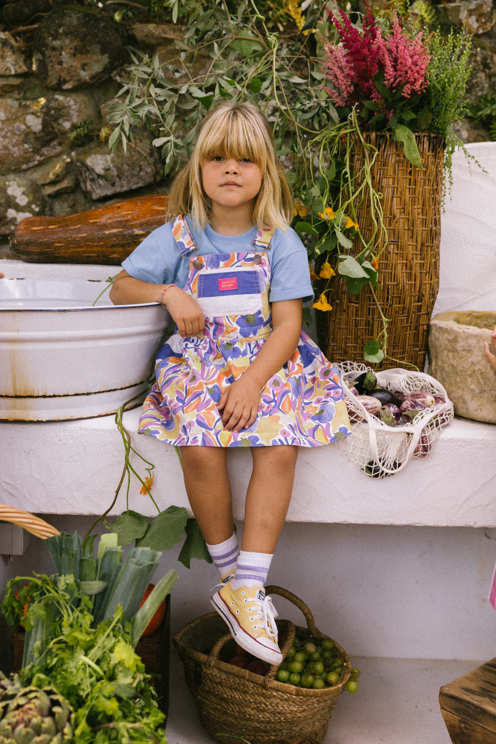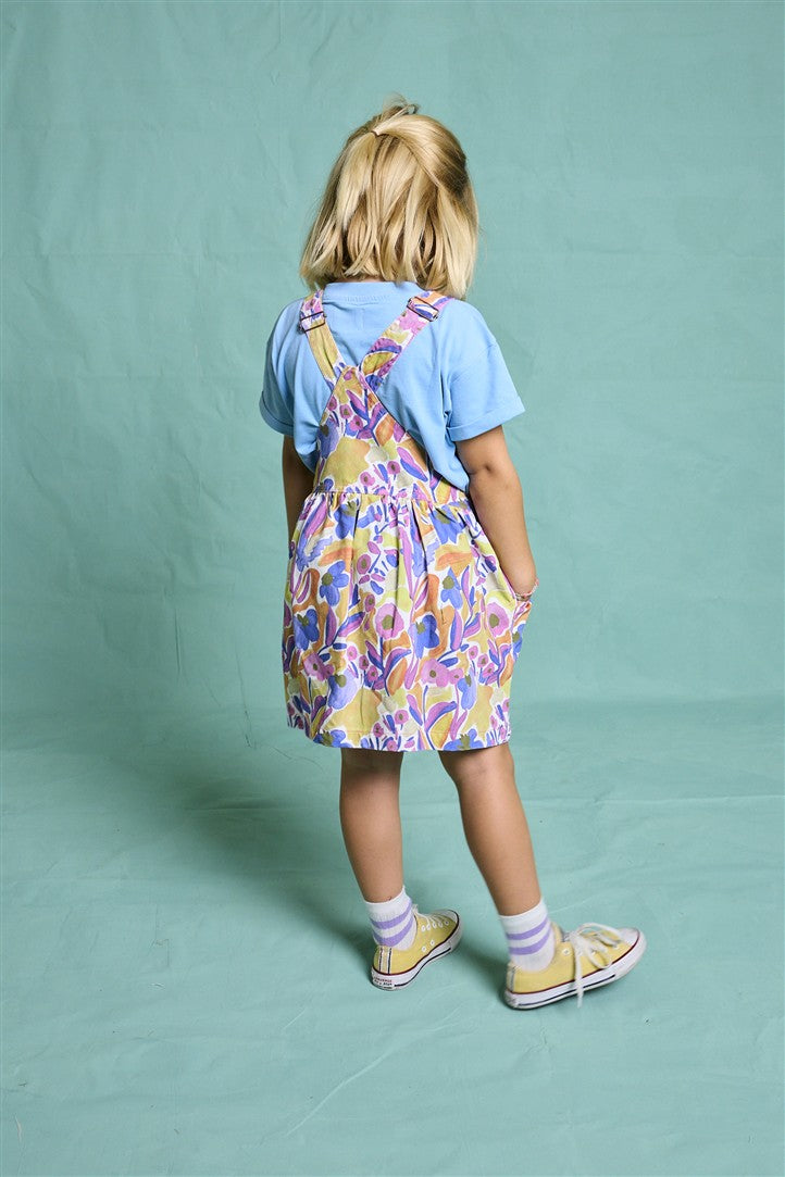 Jurk met vrolijke zomerse print. Veelkleurige aquarel bloemenprint.