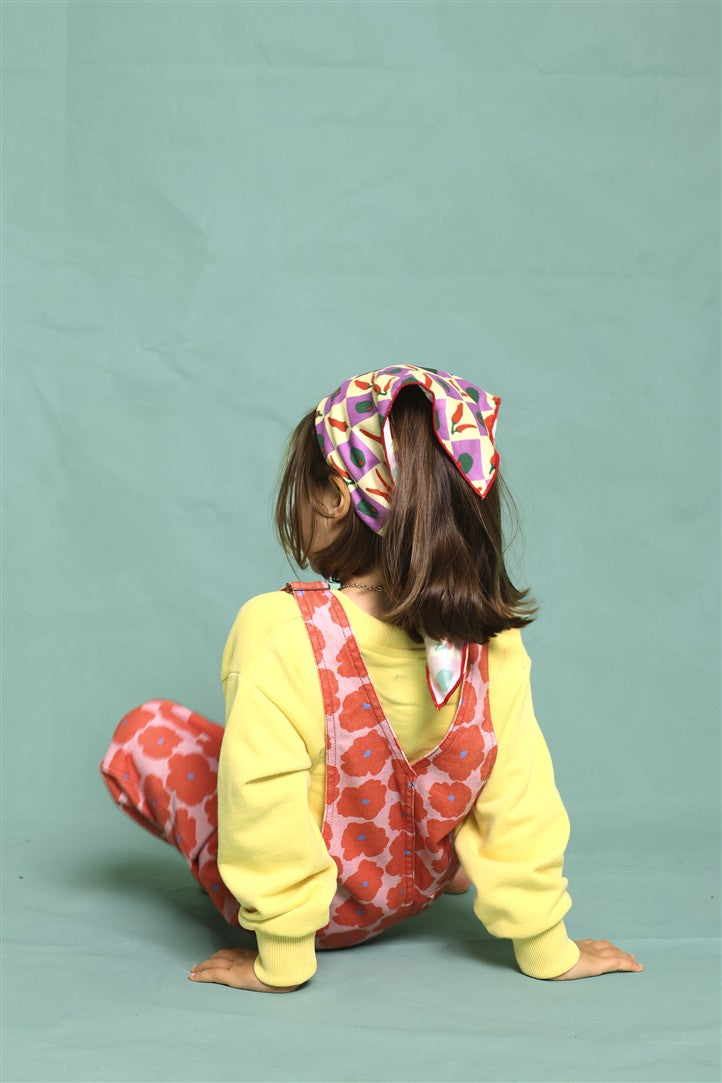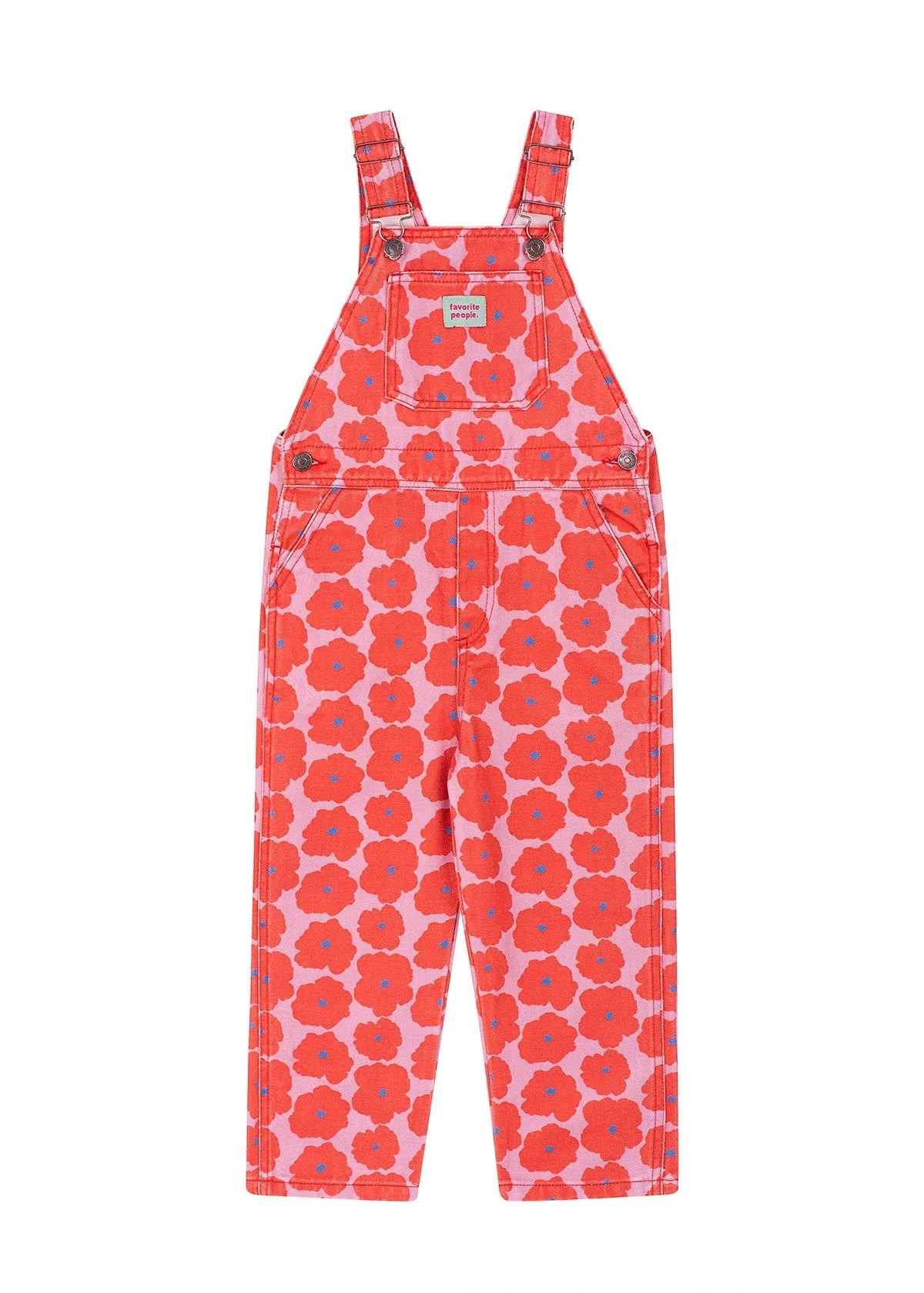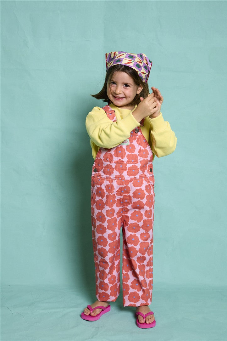 Zomerse salopette met all-over klaprozen print op een roze achtergrond.