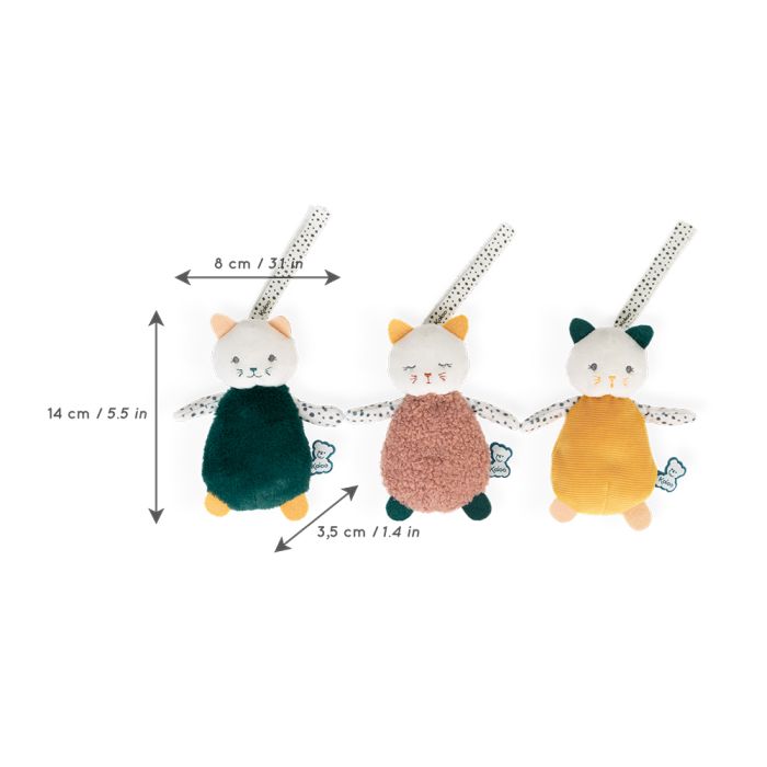 Ontdek de drie bijzondere katten (14 cm) die de zintuigen van je baby prikkelen vanaf de geboorte! Eén kat is zwaar, één licht, één pluizig en één met geritselvacht. Verschillende kleuren, patronen en texturen stimuleren tast, zicht en fijne motoriek. Met handige lintjes om overal op te hangen – spelen en ontdekken was nog nooit zo leuk!