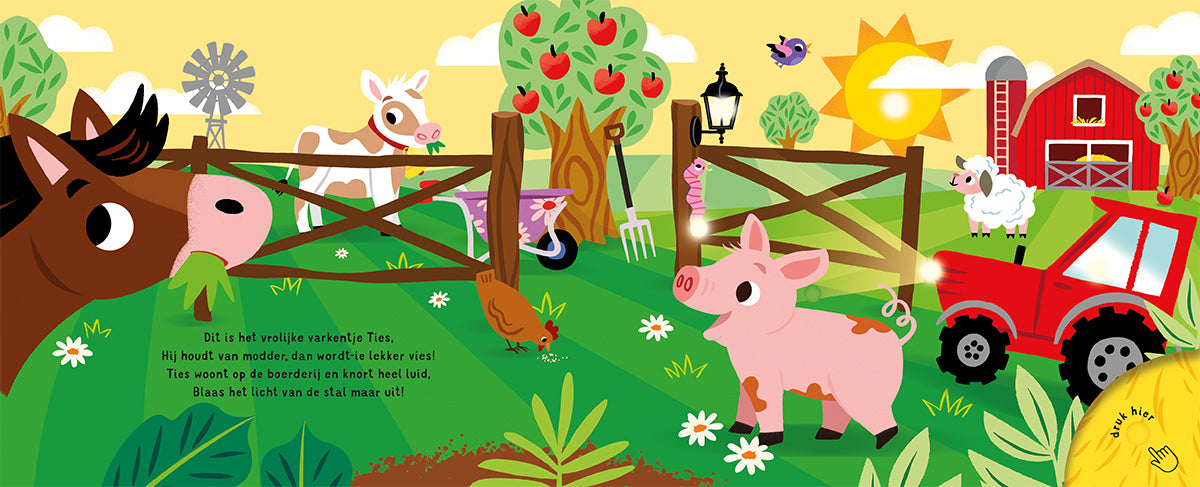 Ga je mee op avontuur op de boerderij? Met een druk op de knop in de hoek laat je de lampjes twinkelen en fonkelen - blaas in het midden en ze gaan weer uit!