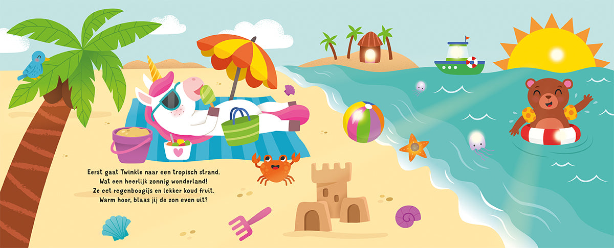 Ga je mee op avontuur met Twinkle? Met een druk op de knop in de hoek laat je de lampjes twinkelen en fonkelen - blaas in het midden en ze gaan weer uit!