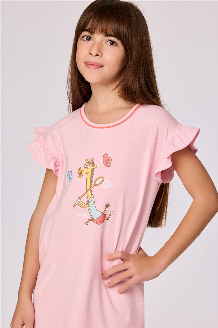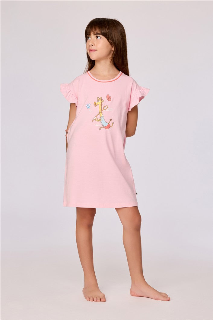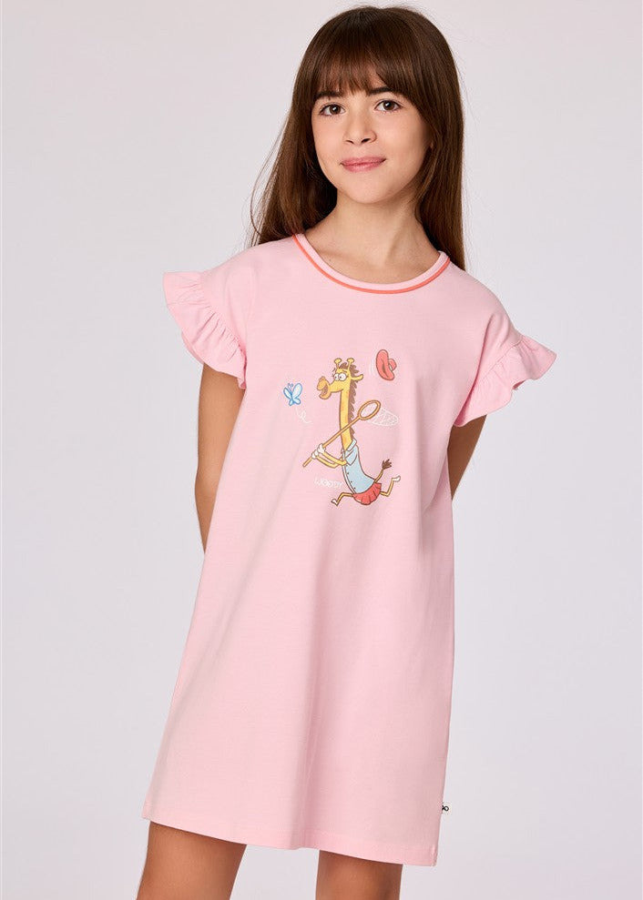 Lichtroze slaapkleed met korte mouw en opdruk van een giraf.