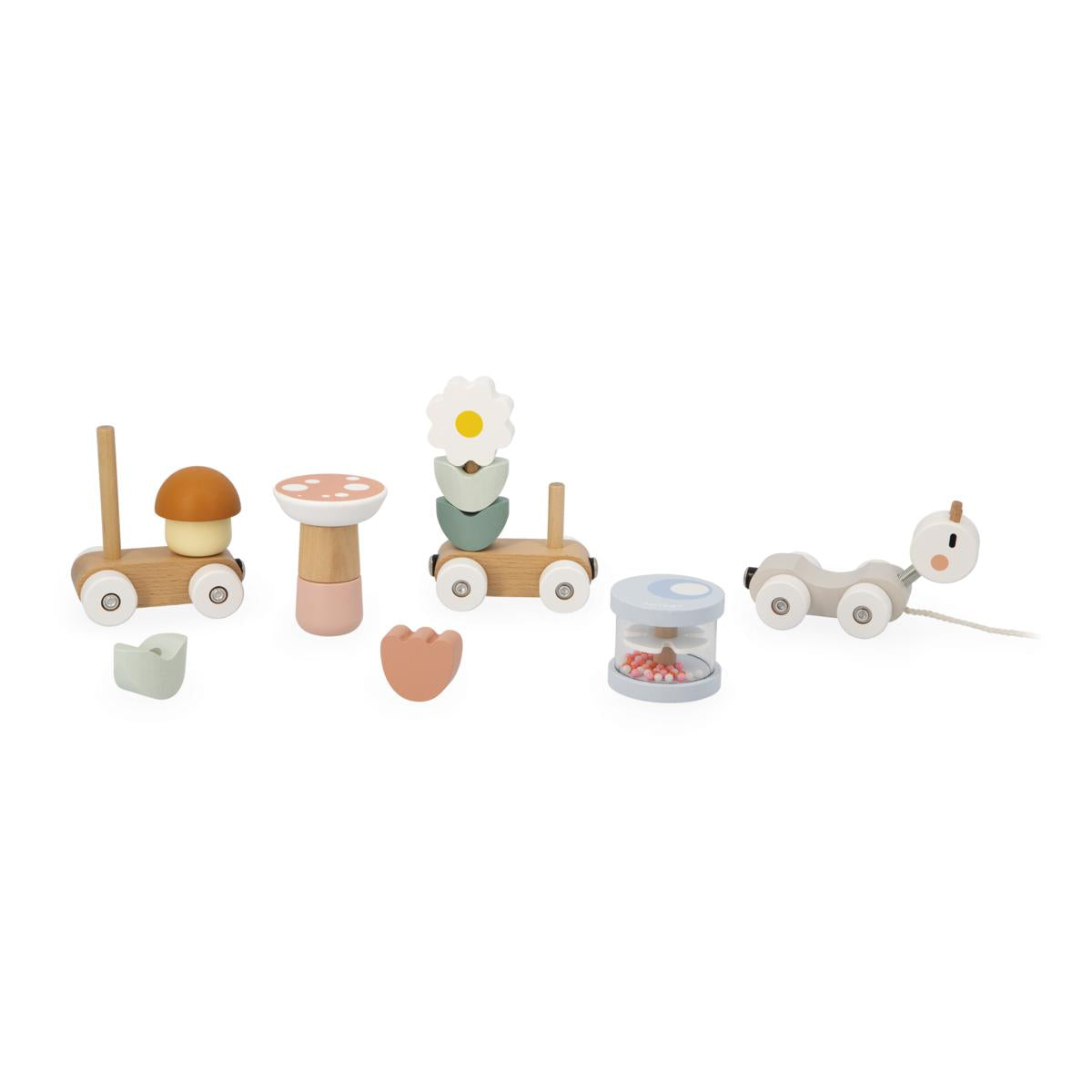 Op weg voor een rustige wandeling, om bloemen en paddenstoelen te ontdekken. Mooie slakkentrein bestaande uit 3 wagons met 2 bloemen en 2 paddenstoelen om te maken (10 stuks). Het slakkenhuis is afneembaar: het rolt uit zichzelf wanneer de trein rijdt en verandert in een rammelaar met balletjes.