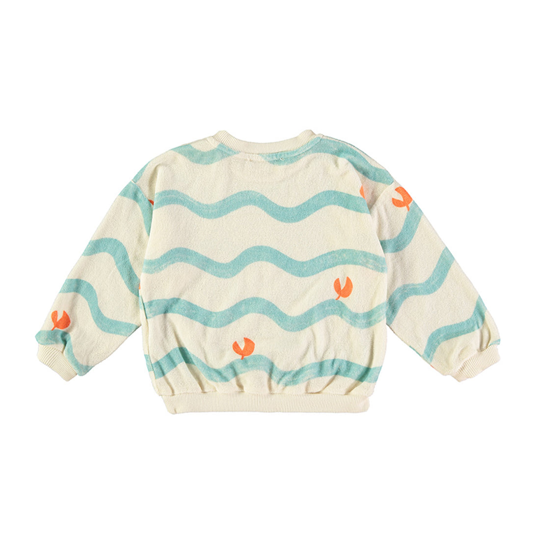 Witte sweater met blauwe golvende lijnen en oranje krabbepoten.