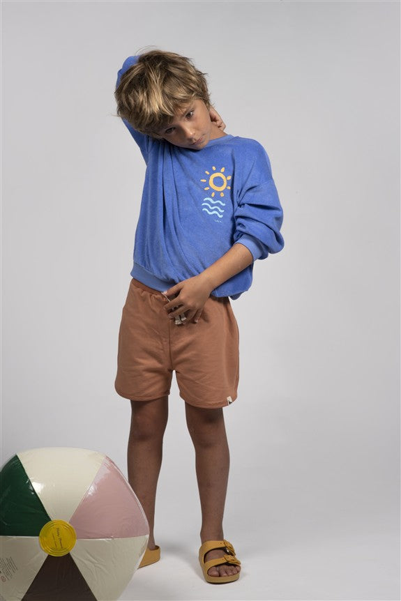 Sweater in blauwe badstof met zon & zee opdruk vooraan.