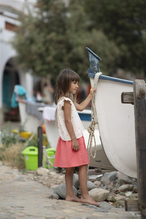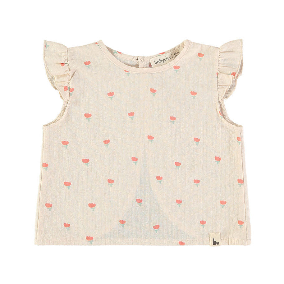 Prachtige top met speciale rugzijde in ecru katoen met bloemen.