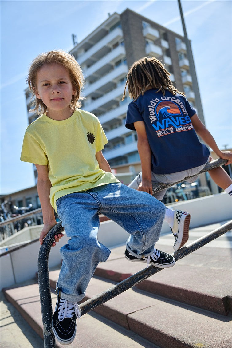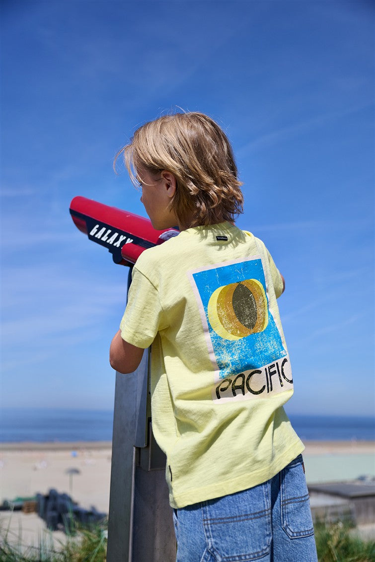Zachtgele tshirt met blauwe print op de rugzijde.