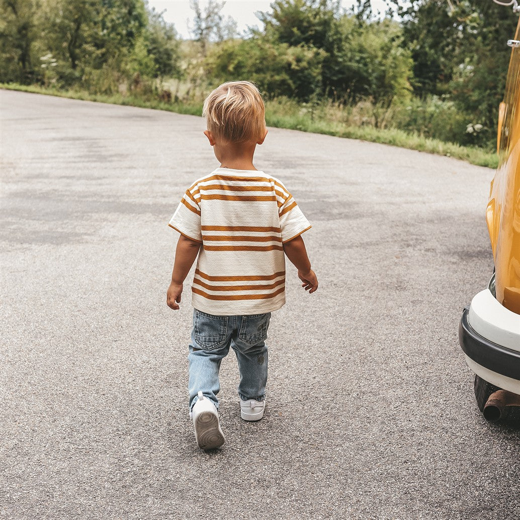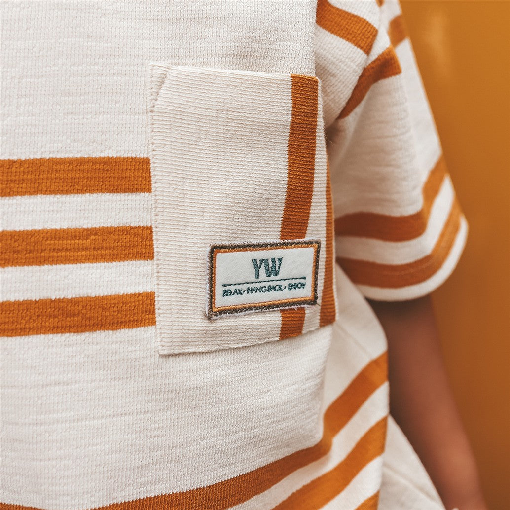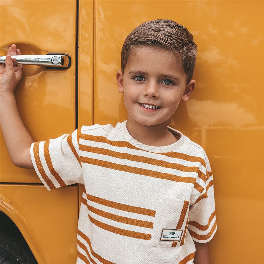 Ecru tshirt met oranje strepen in een zomerse sweatstof.