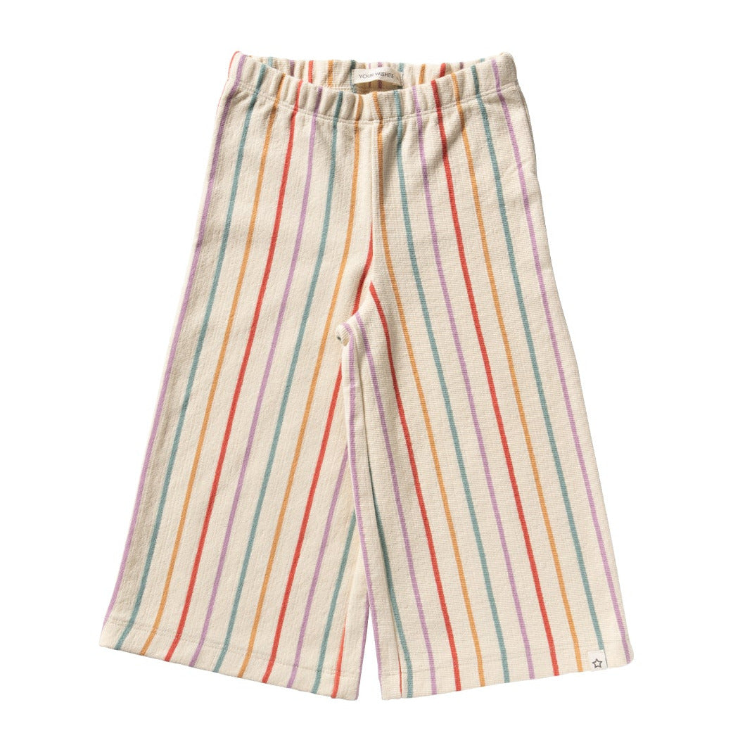 Ecru broek met wijde pijpen en streepjes in de regenboogkleuren.